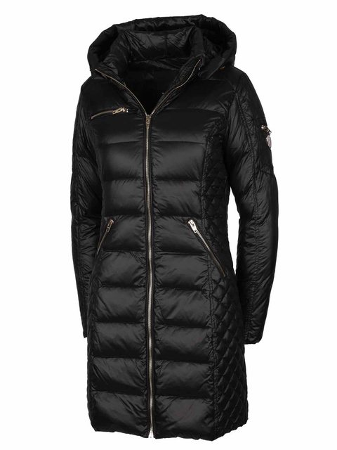 ROCKANDBLUE CIARA BARE 90 cm - Czarny puchowy płaszcz o bardzo wąskim kroju z kapturem bez obszycia