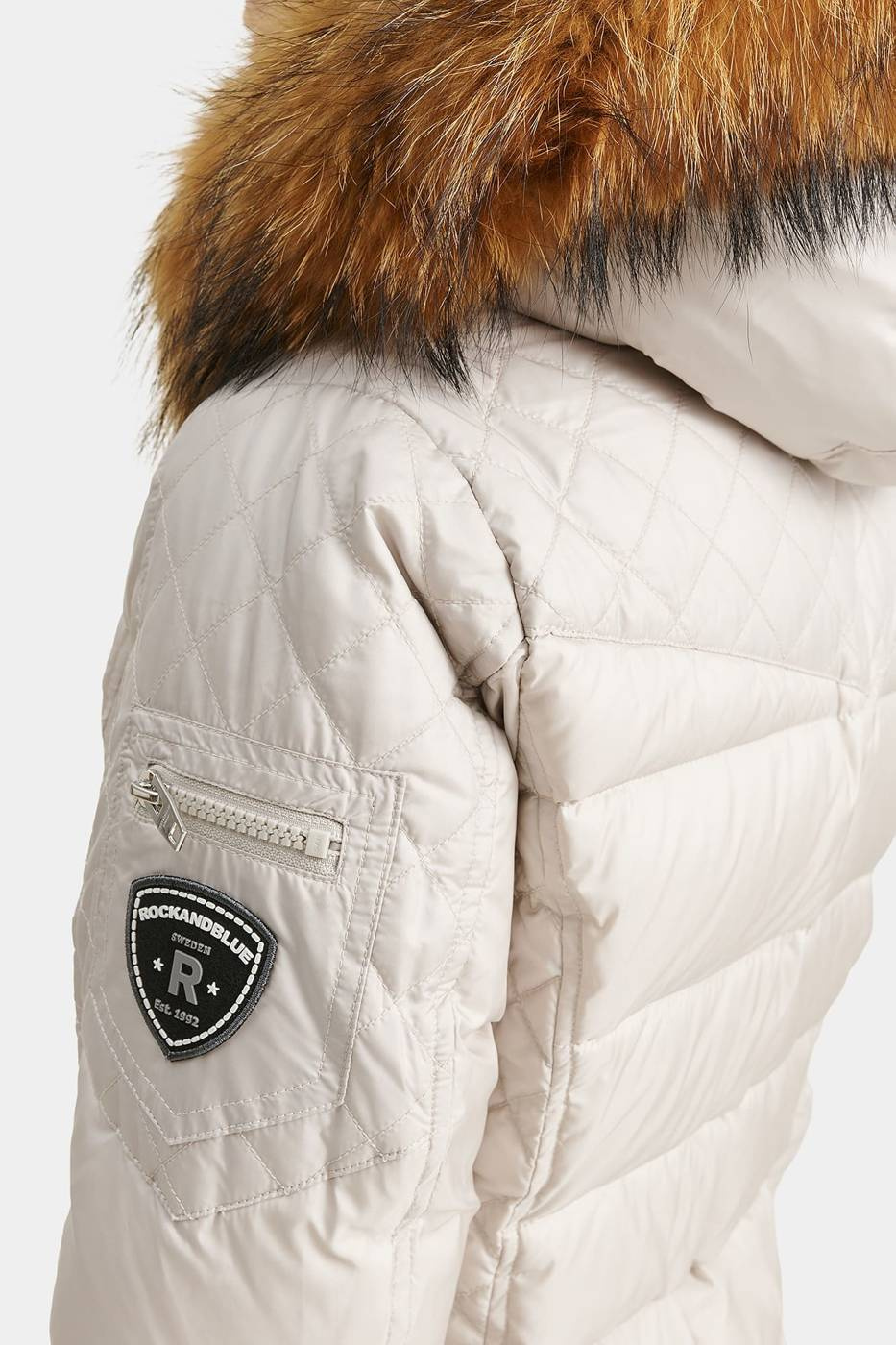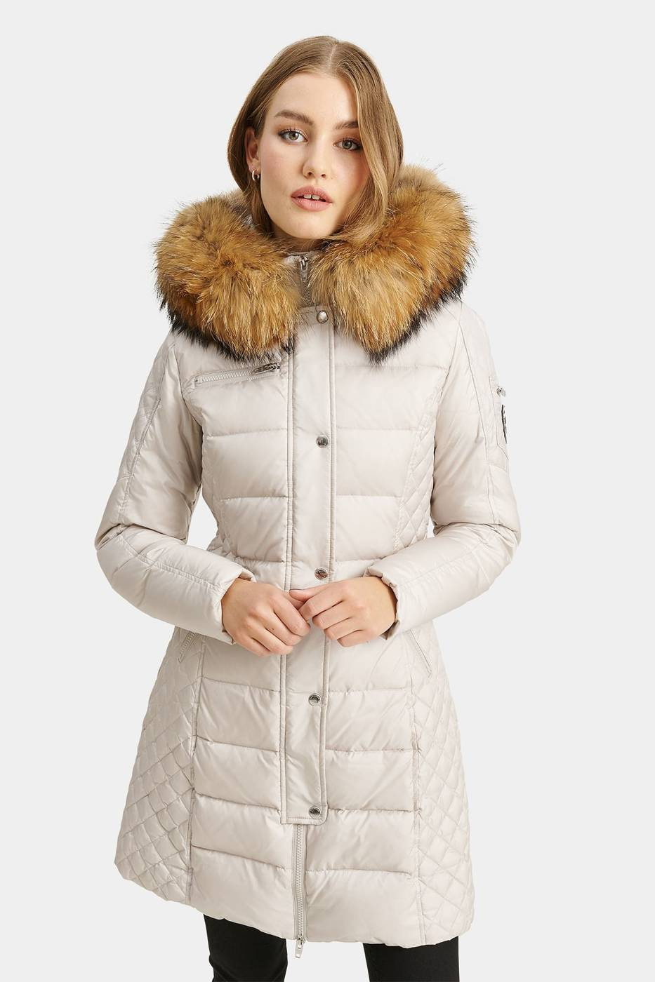 - Ciepły i modny płaszcz puchowy BEAM od ROCKANDBLUE z kapturem i kołnierzem z futra jenota.