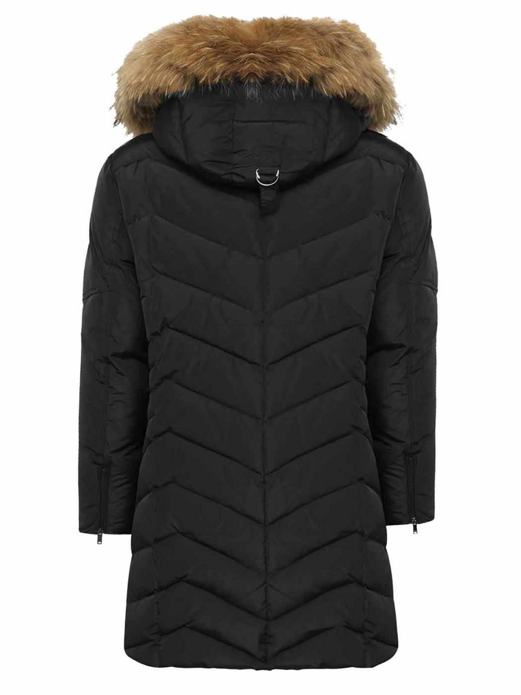 Kobieca kurtka puchowa o luźnym kroju z detalami na tułowiu. Posiada wygodny kaptur i dwie skośne kieszenie z przodu zapinane na zamek błyskawiczny. Posiada certyfikat odpowiedniego standardu puchowego (RDS) i jest pokryta wodoodporną powłoką BIONIC-FINISH®ECO. Długość tyłu: 93 cm.
